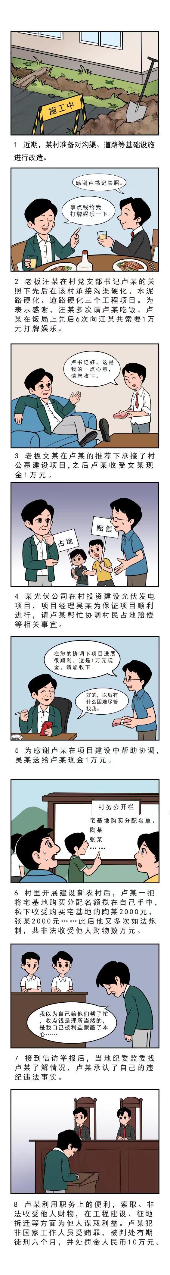 盧某,中共黨員,某村原黨支部書(shū)記、村主任。2006年至2017年,汪某在盧某的關(guān)照下先后在該村承接溝渠硬化、水泥路硬化、道路硬化三個(gè)工程項目。為表示感謝,汪某多次請盧某吃飯。盧某在飯局上先后6次向汪某共索要1萬(wàn)元打牌娛樂(lè )。2013年,文某在盧某的推薦下承接了村公墓建設項目,之后盧某收受文某所送現金1萬(wàn)元。2017年,某光伏公司在村投資建設光伏發(fā)電項目,項目經(jīng)理吳某為保證項目順利進(jìn)行,請盧某幫忙協(xié)調村民占地賠償等相關(guān)事宜,后項目在盧某的協(xié)調下順利進(jìn)行。2018年年初,為感謝盧某在項目建設中幫助協(xié)調,吳某在項目指揮部辦公室送給盧某現金1萬(wàn)元。